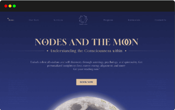 Nodes and the Moon is a spiritual guidance platform offering personalized sessions. The landing page was designed to capture its mystical essence while staying clean and intuitive. The focus was on clarity, trust, and smooth user flow.